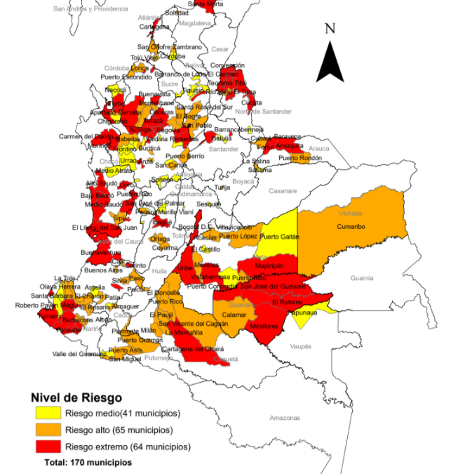 hay seis zonas prioritarias: Centro de Arauca (Arauquita, Fortul, Saravena), Norte de Antioquia y Sur de Bolívar, Andén Pacífico Colombiano (33 municipios tienen riesgo extremo), Norte del Cauca, Suroriente colombiano, Medio y Bajo Putumayo.